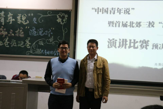 晚上6时许,“中国青年说”首届北郊三校“演说杯”演讲比赛预决赛在一段酷炫的开场视频中正式开始。接着,两位主持人为大家介绍到场嘉宾以及九位选手播放选手的VCR。随着赛程的进行,选手们一个接一个的展精彩的演讲。第一轮演讲文稿由选手自己准备,所有的选手都积极的展现自我,自信沉着,不负众望,凭借流利的口才、自信的姿态和自然丰富的肢体语言展示了当代青年大学生的风采,赢得了评委和同学们阵阵掌声。其间伴着文艺部的同学为我们带来美妙的歌曲,使会场气氛更加热烈。第一轮演讲结束后,团委副书记张国豪进行总结。在文艺的同学优美的歌声过后,比赛继续进行第二轮。第二轮演讲是选手在第一轮自我演讲结束后,自己抽取即兴演讲主题,每位选手通过冷静的分析、镇定的思考加上严谨的语言,为我们带来了又一场视觉与听觉的盛宴。最后,由电信学院团委副书记夏开成老师进行总结,对同学们的表现进行点评。在欢跃的音乐中,主持人宣布本次比赛获奖名单,由嘉宾授予选手证书并合影留念,比赛于8时30分结束。