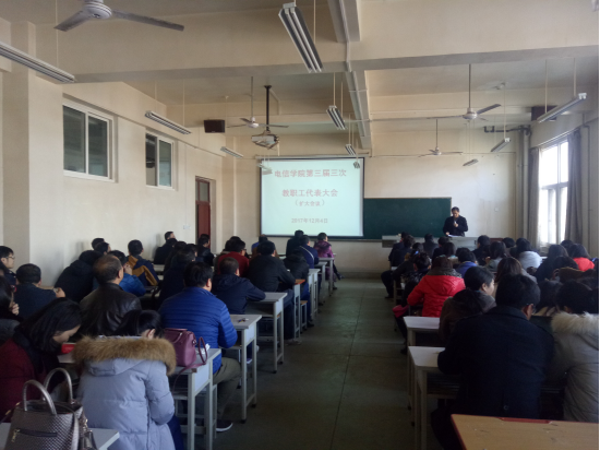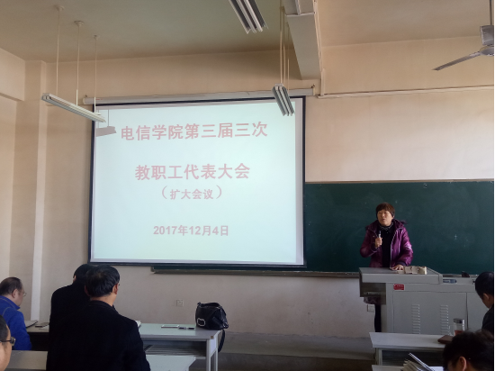 12月4日,电信学院第三届三次教职工代表大会(扩大会议)在工科5楼406教室隆重举行,学院全体领导及教师参加会议,工会主席张海宁老师主持会议。
