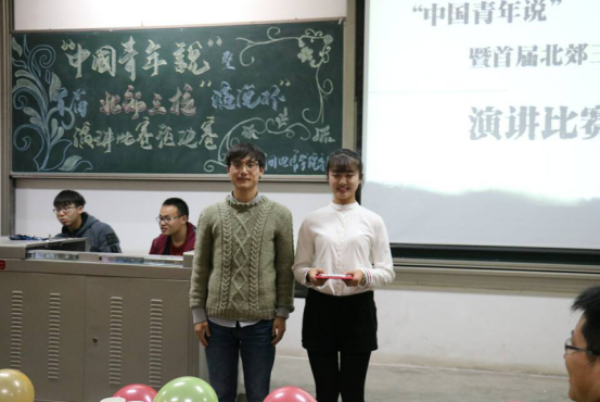 晚上6时许,“中国青年说”首届北郊三校“演说杯”演讲比赛预决赛在一段酷炫的开场视频中正式开始。接着,两位主持人为大家介绍了到场嘉宾以及九位选手并播放选手的VCR。随着赛程的进行,选手们一个接一个的展示精彩的演讲。第一轮演讲文稿由选手自己准备,所有的选手都积极的展现自我,自信沉着,不负众望,凭借流利的口才、自信的姿态和自然丰富的肢体语言展示了当代青年大学生的风采,赢得了评委和同学们阵阵掌声。其间伴着文艺部的同学为我们带来的美妙的歌曲,使会场气氛更加热烈。第一轮演讲结束后,团委副书记张国豪进行总结。在文艺部的同学优美的歌声过后,比赛继续进行第二轮。第二轮演讲是选手在第一轮自我演讲结束后,自己抽取即兴演讲主题,每位选手通过冷静的分析、镇定的思考加上严谨的语言,为我们带来了又一场视觉与听觉的盛宴。最后,由电信学院团委副书记夏开成老师进行总结,对同学们的表现进行点评。在欢跃的音乐中,主持人宣布本次比赛获奖名单,由嘉宾授予选手证书并合影留念,比赛于8时30分结束。