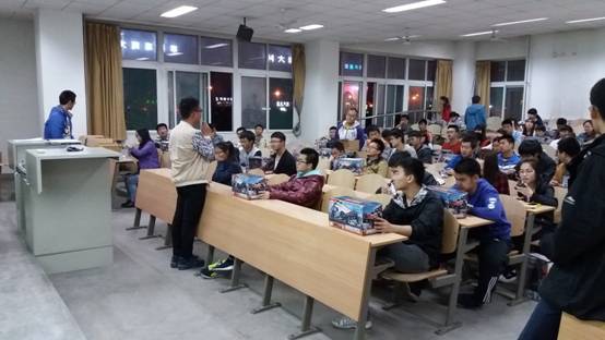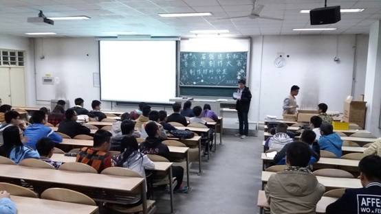 下午18时许,参赛选手们便陆陆续续地到达会场,在教室门口确认过组号以及个人信息后便各自找了座位坐下。19:00会议正式开始,首先由主持人对本次比赛的项目进行了详细的介绍,并阐明了各种注意事项。随后,宣传部长们开始分发比赛的制作材料,材料共由电子元件和用作底盘的遥控车组成。主持人按照报名表上的顺序读了组号,选手们便按顺序依次上台领取材料,并在报名表上签字确认。待材料分发工作完成后,主持人在大屏幕上展示了各种元件的样式和数量,并细心地提醒选手们检查元件的情况以及是否损坏。检查完毕后,部长们对缺少元件的队伍进行了登记并根据记录对他们缺少的器件进行了补充。元件分发完毕后,由主席上台做会议总结。主席对本次比赛提出了几点要求,并着重中强调了公平比赛的重要性。2030分,会议在热烈的掌声中圆满结束。