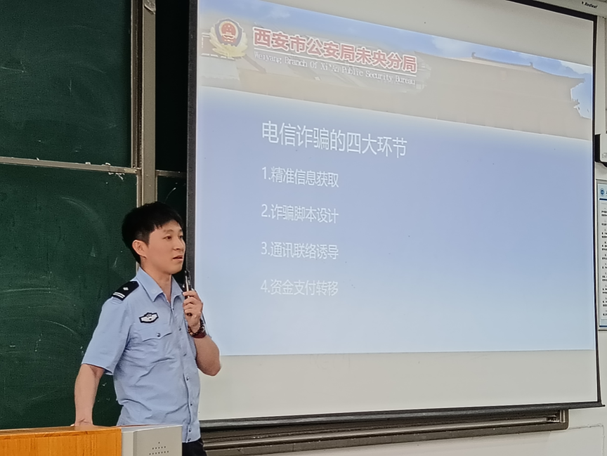 特邀公安未央刑侦大队曹警官入校,在教1-103开展人身及财产安全法制宣讲活动,为同学们带来了一场干货满满的反电信诈骗讲座。