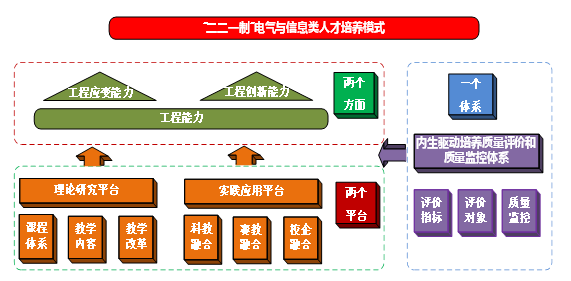 “二二一制”电气与信息类人才培养模式以全方位、全覆盖、内生性为特点,第一个“二”是指工程能力涵盖的两个方面:工程应变能力、工程创新能力;第二个“二”是指支撑工程能力提升的两个平台:理论研究平台、实践应用平台;“一”是指保障工程能力提升的一个体系:内生驱动的培养质量评价和质量监控体系。