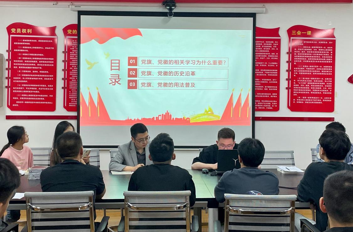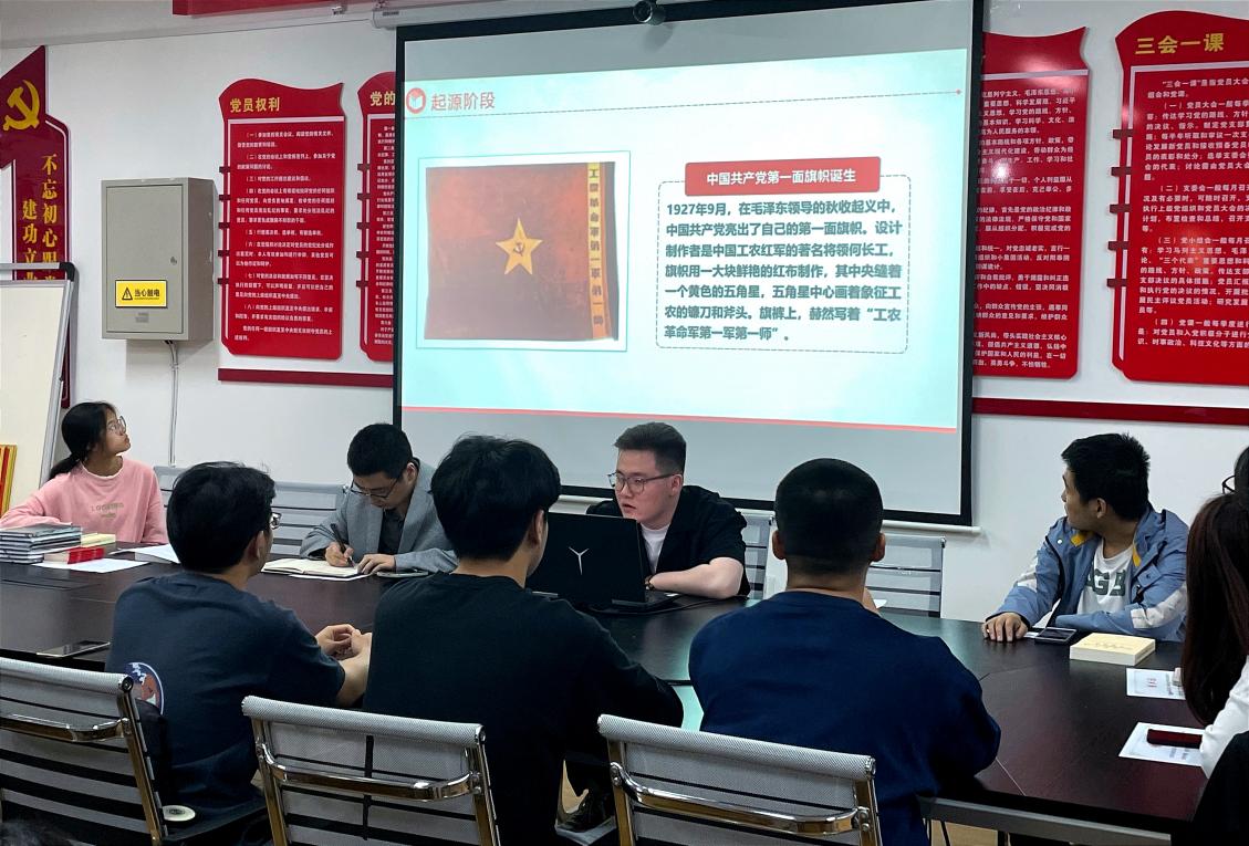 紧接着,由支部副书记张展源带领支部全体同志进行了一次党课学习。本次党课主要围绕“党旗党徽的历史沿革”这一主题进行展开,从“党旗、党徽的相关学习为什么重要”、“党旗、党徽的历史沿革”、“党旗、党徽的用法普及”这三个方面进行了讲解。之后,支部书记王辛进行了总结,他讲到:“党员的理论学习和政治素养提升是持续一生的课题,在这个信息庞杂时代里,希望支部的每一位同志不忘初心、踔力奋发,做一位合格的、优秀的共产党人。”