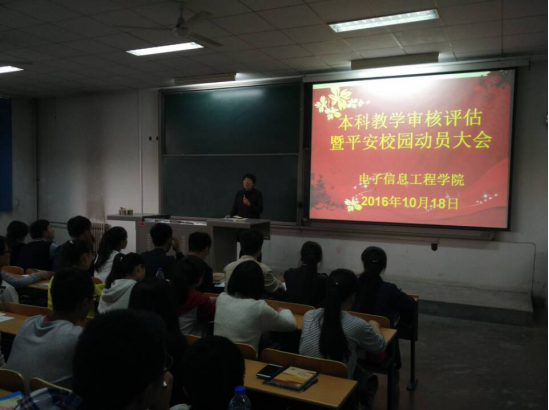 在教1-201召开了本科教学审核评估暨平安校园动员大会。出席本次会议的有电信学院党委书记张忠副教授,学院辅导员刘叶楠老师。电信学院各党支部党员代表、各年级班干部、入党积极分子与会。