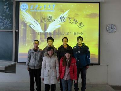 各学院代表分别上去讲述他们那些自立自强的故事,他们都有不同的故事,不一样的经历,但他们对待困境的勇气和态度却是相同的。他们感染了在场的所有人,都为他们鼓掌呐喊,相信他们是大家学习的榜样。最后由主持人宣布会议结束,老师代表和学生合影留念。