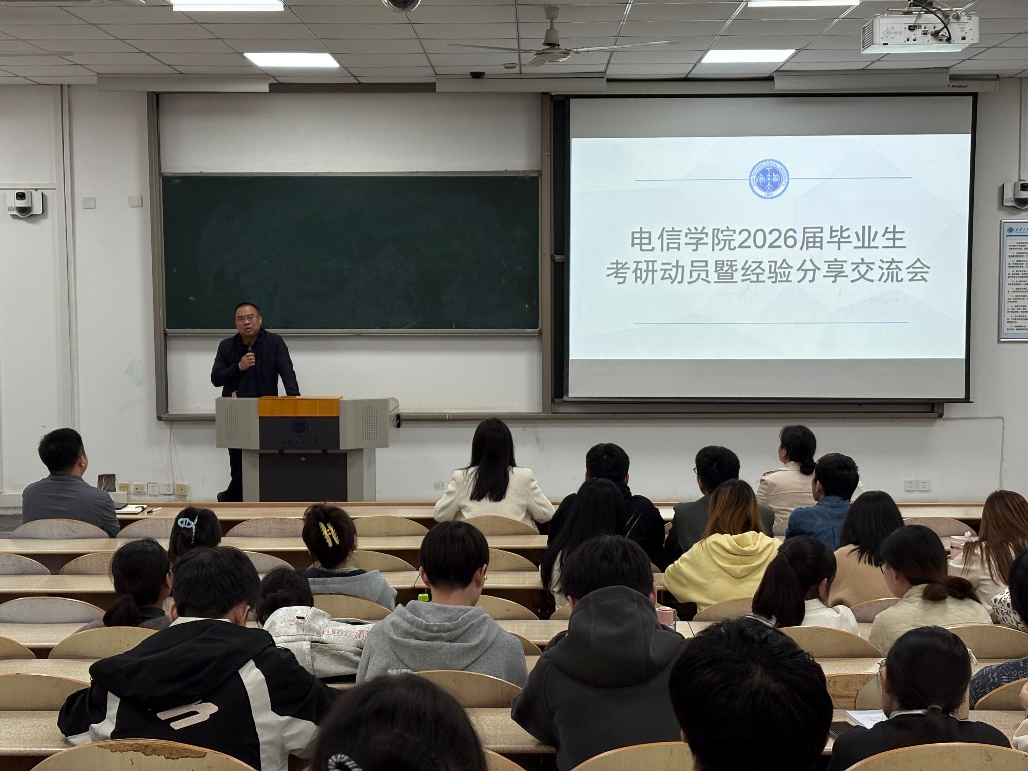 会上,两位成功上岸本校的研究生分别分享了自己的考研经验。两位学长、学姐从院校选择、复习计划、复试技巧等方面展开,结合自身经历建议同学们根据专业优势与个人基础合理定位目标院校,还分享了公共课与专业课的高效复习技巧,强调错题整理与心态调节的重要性。