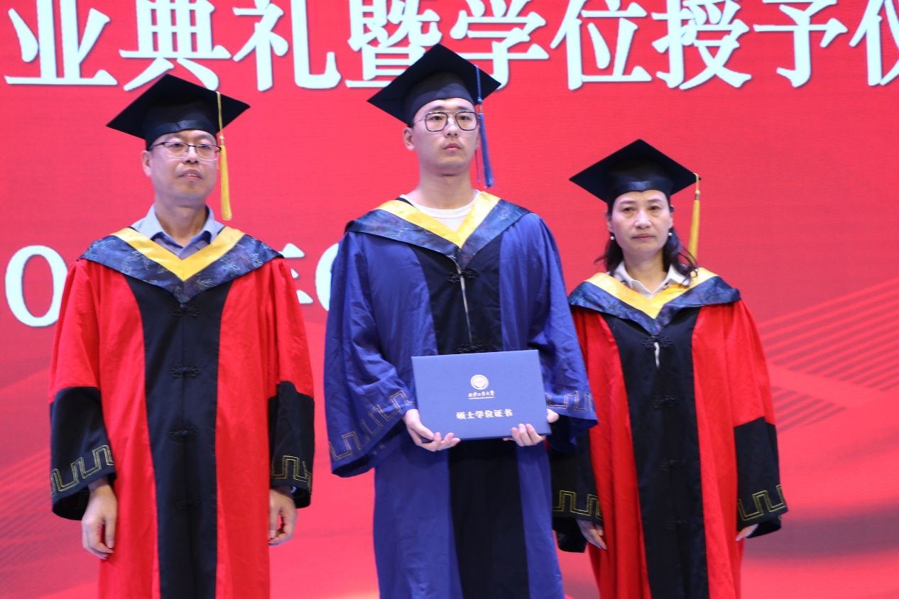 仪式在满载温馨回忆和惜别之情的毕业视频《离别开出花》中拉开序幕。副院长赵黎宣读学校学位评定委员会2024届毕业生学位授予决议。院长陈超波,副院长宋晓茹、赵黎分别为毕业生拨穗正冠,授予工学硕士学位、学士学位证书,并合影留念,恭贺毕业生学业礼成。