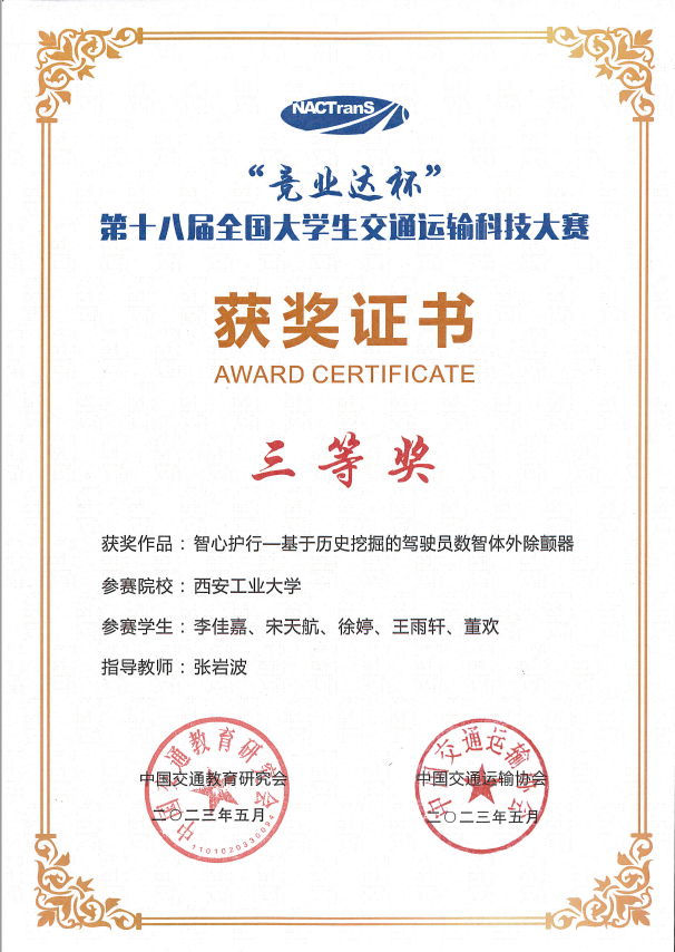 我校张岩波老师指导成人短剧 李佳嘉等5名本科生完成的项目《智能护行—基于历史挖掘的驾驶员数智体外除颤器》,斩获全国三等奖1项,是目前我校在交通运输领域国家级学科竞赛的最好成绩。