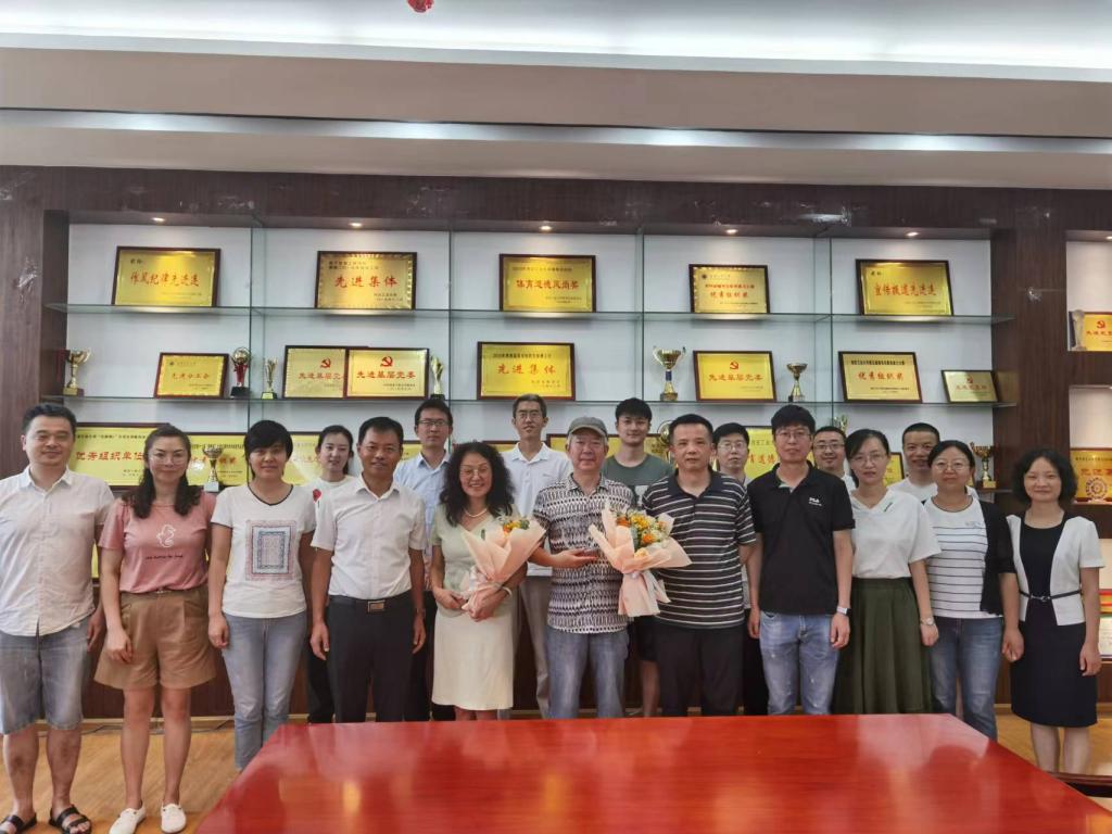 最后,易超书记代表学院为两位退休教师赠送礼物和鲜花,全体参会教师与两位退休教师合影留念。