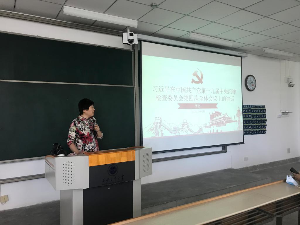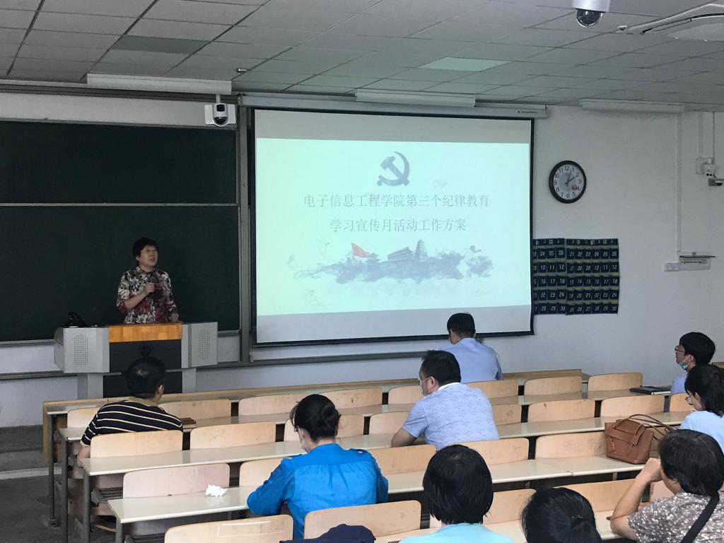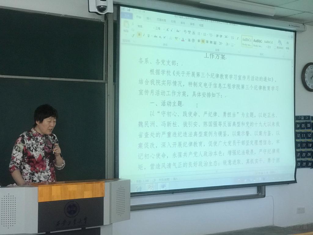第三个纪律教育学习宣传月活动工作方案”。就抓好纪律教育宣传月活动进行了安排部署,她要求学院各系主任、各支部书记,紧扣“守初心、践使命、严纪律、勇担当”这个主题,从思想上提高政治站位,加强组织领导,行动中注重统筹兼顾,促进工作融合,活动中创新方式方法,提升活动质效。将开展的“话廉洁、守初心”专题研讨,“倡廉洁、践使命”主题党日活动,“知廉洁、严纪律”党纪法规知识测试及“践廉洁、勇担当”正反面典型教育活动落到实处,确保纪律教育学习宣传月活动取得实质成效。