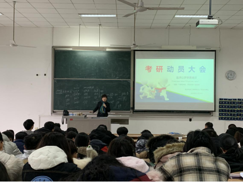 会上,张忠老师作了动员讲话。她从大数据开始分析,与双一流高校做比对,给大家分析了最近几年的考研和就业严峻形势:报考人数增加、招生人数增加、就业形势的严峻、国家需求等方面鼓励大家根据自身实际,努力备考。她向大三学子们详细的阐述了考研的重要性,考研是提升自我的重要途径,希望同学们积极考研深造,努力寻求能够施展个人才能的更大空间,为将来成为国家栋梁之才、实现人生梦想而不懈奋斗。她指出当今社会越来越重视知识层次的高低,因此考研也就成了现代教育发展的必然趋势,同学们可以通过考研来提升自己的学习能力、工作能力以及社会竞争力,这样才能更好的适应社会。
