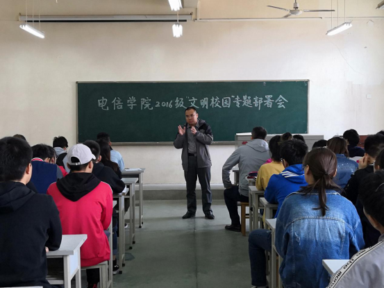 10月18日,电信学院在工5-406教室组织召开2016级学生“文明校园”创建工作专题部署会。学院党委副书记王利军、辅导员张鹏出席会议,2016级各班长、支书以及全体学生党员100余人参加会议。